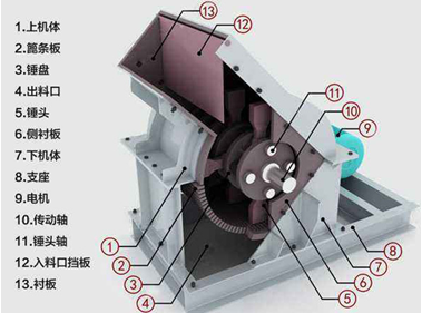 錘式破碎機是靠懸掛在轉子上的活動錘頭由轉子帶動轉子高速轉動用沖擊力打擊物料,達到破碎的目的。